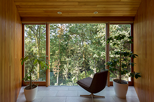 リビングの一角にある眺めを楽しむコーナーです。景色に合わせて、壁と天井を存在感の強い唐松の板張りにしています。