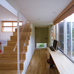 廊下沿いの書斎と畳室の間に階段がある間取りです。階段下は、書斎の側を本棚に、畳室側を布団と子どものおもちゃ入れにしています。